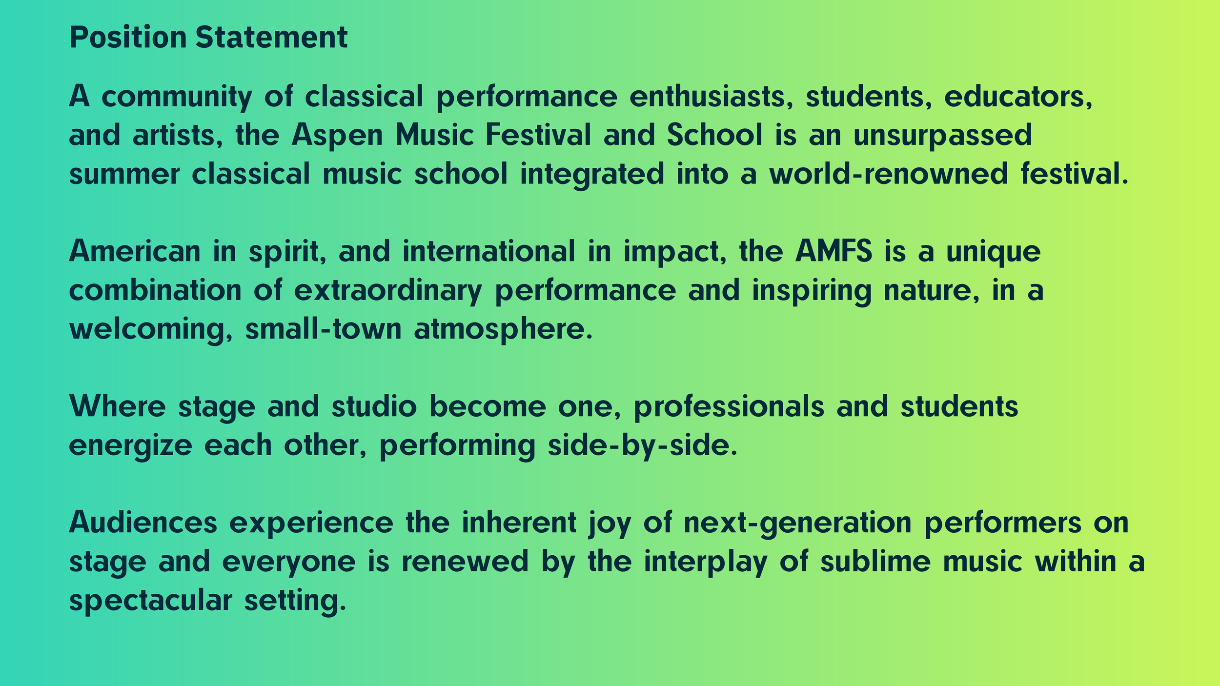 The resulting brand strategy that we developed, based on this research, articulates a mix of extraordinary performance, focused teaching, natural splendor, and Aspen’s small-town charm—a combination that all constituents find uniquely compelling about the AMFS experience.