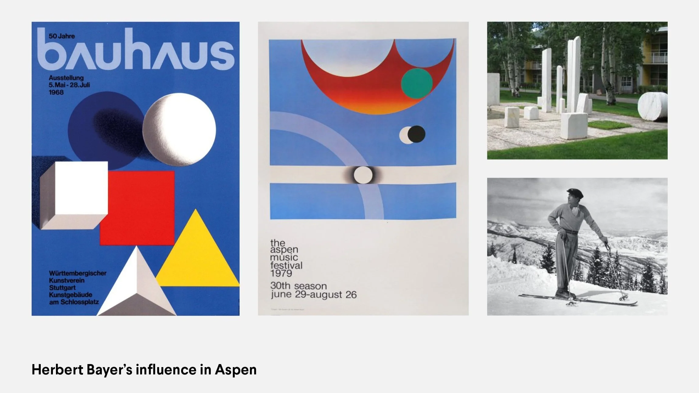 Bayer came to Aspen in the 1940s with Walter and Elizabeth Paepcke, creators of The Aspen Idea (integration of body|mind|spirit), and founders of the AMFS and the Aspen Institute. Bayer’s sensibility informed every aspect of Aspen’s transformation from a mining and ranching community to a world-class arts destination. He was responsible for much of the early graphic design for the AMFS and the Aspen Institute.