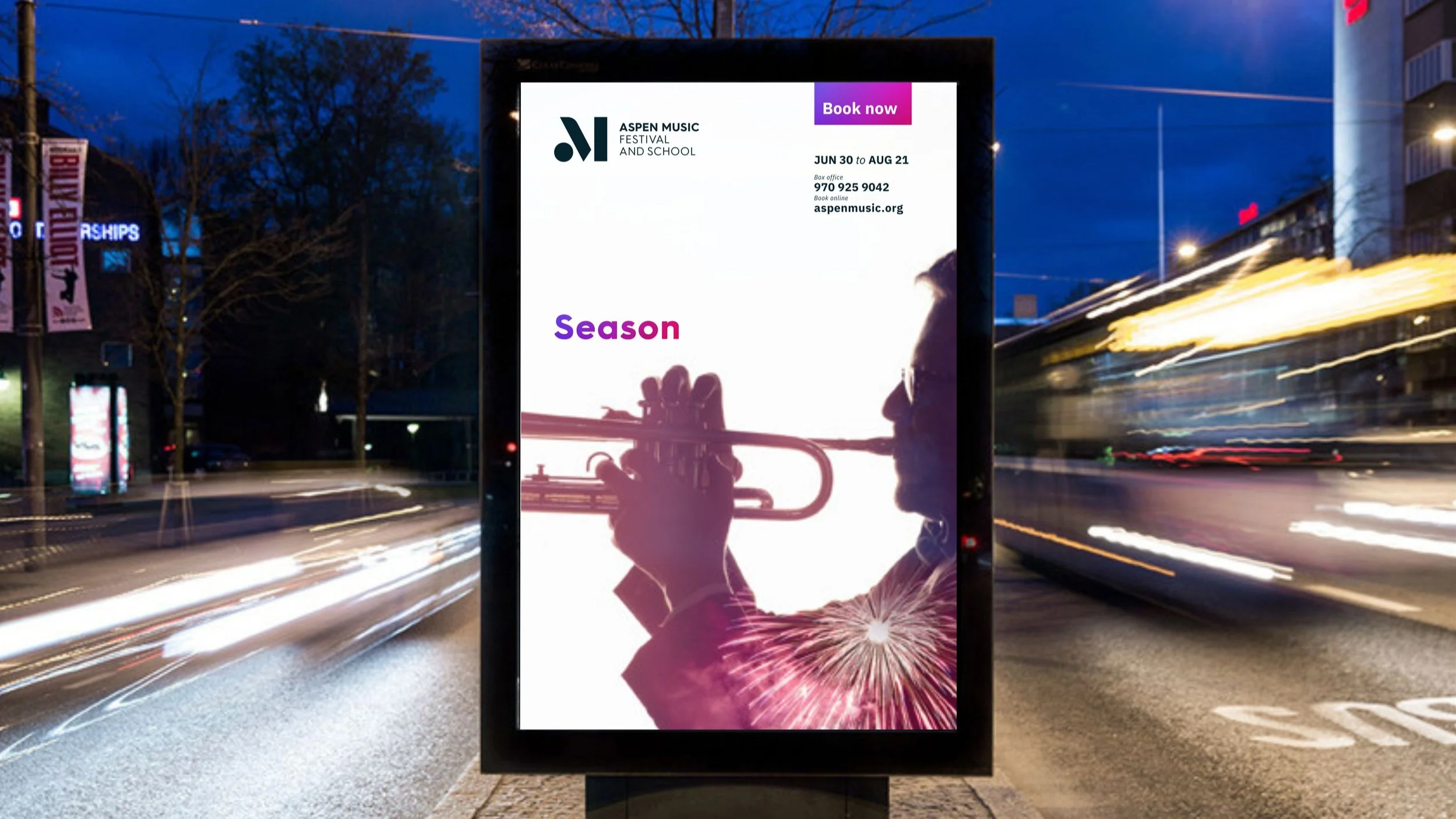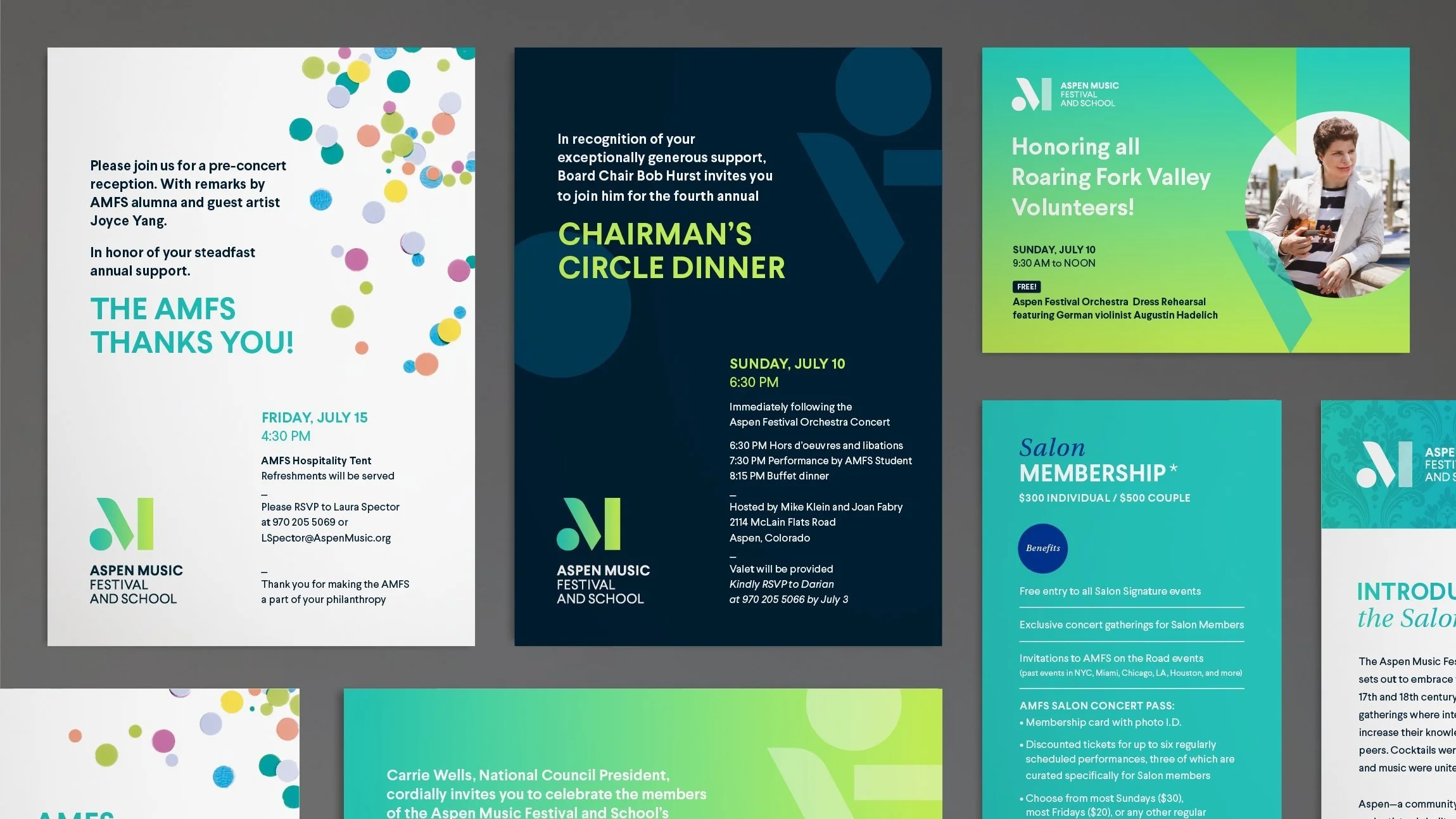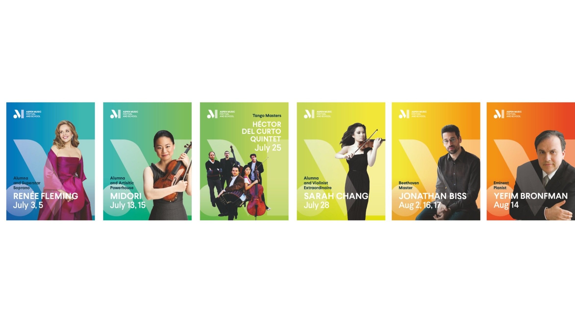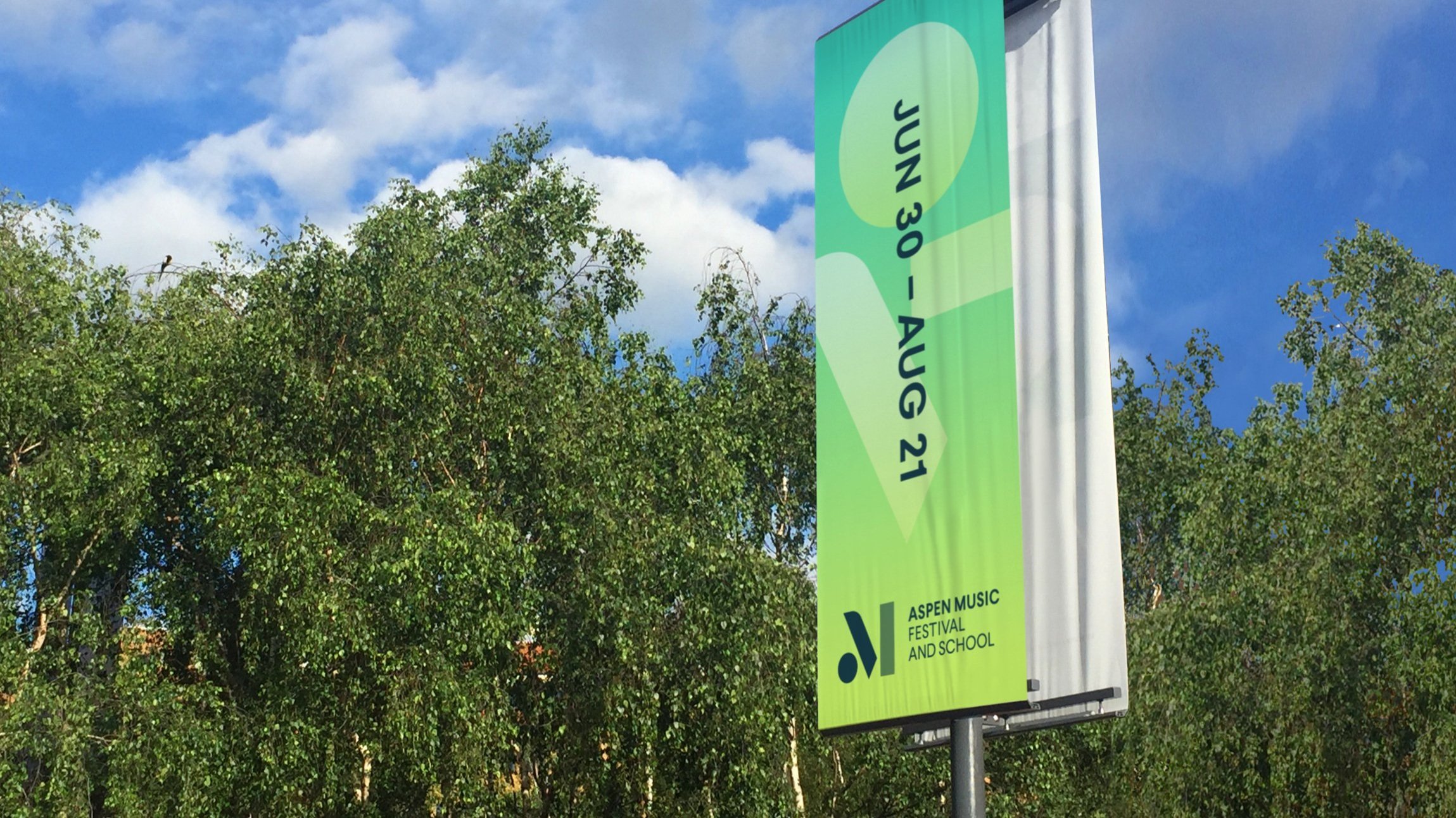 In viewing the new logotype, people see in its shapes an abstract “A” and/or “M,” musical notation, or simply Bauhaus-like shapes. Colors and supporting imagery are inspired by both Bayer’s aesthetics and the natural beauty and feeling of summer in Aspen.